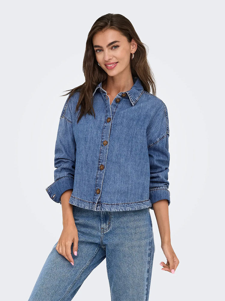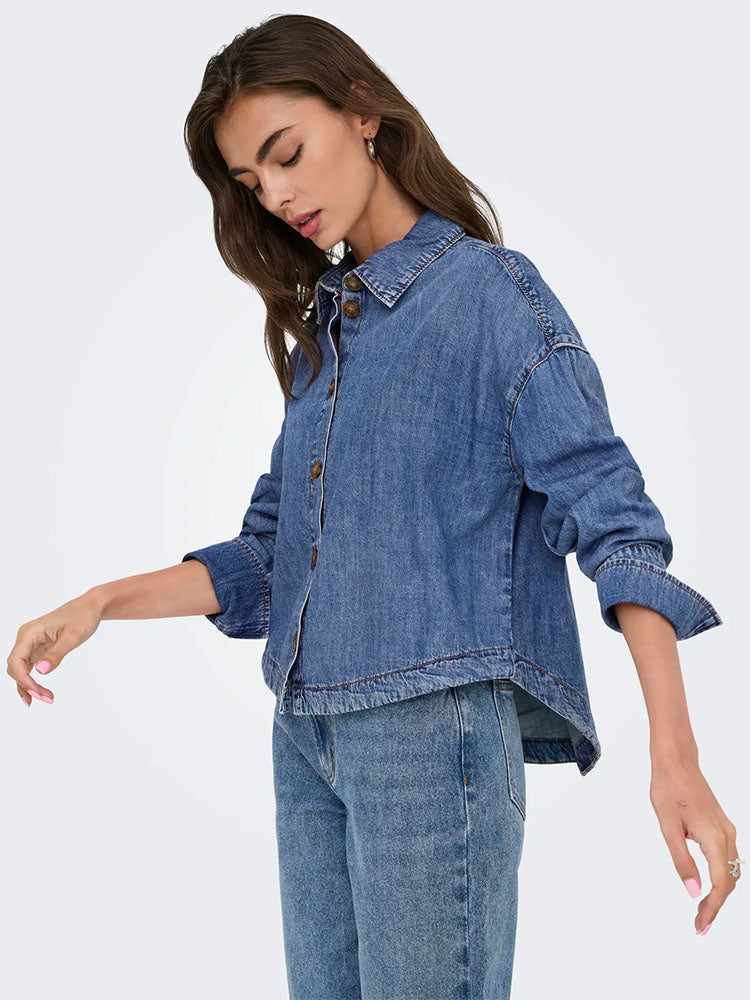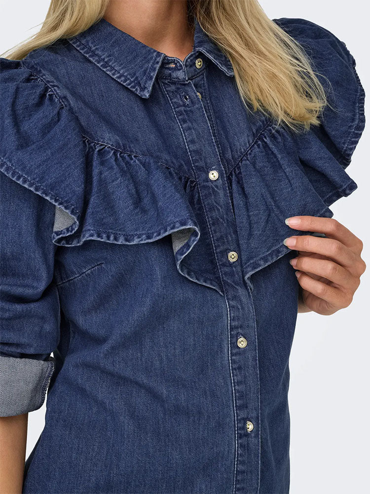 Onlindigo Frill Denim Shirt-Dark Blue Denim